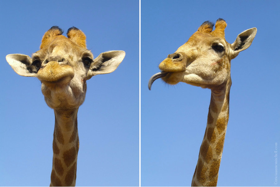 A giraffe, just outside the South African city of Johannesburg, flashes playful expressions.