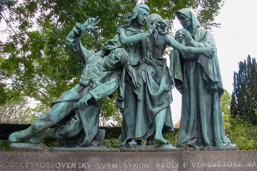 A copper statue of a a man standing atop a memorial. The plaque on the base reads: Aux Combattants Russes tombes dans la resistance francaise pour la liberation au cours de la deuxieme guerre mondiale.