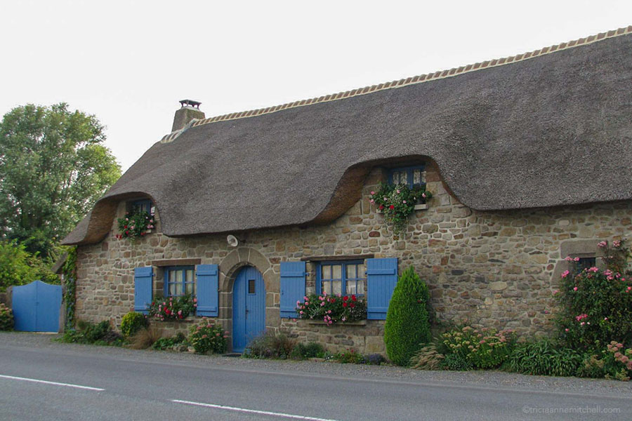 A stone house with thatch roof, blue shutters, and flowers in Normandy / Brittany, France.