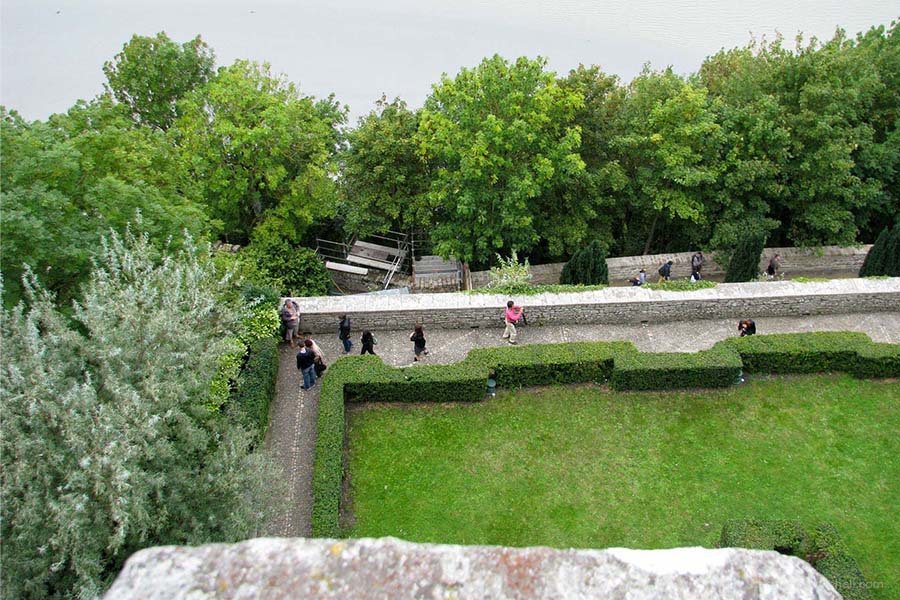 An aerial view of Mont Saint Michel's grounds, with people walking along a sidewalk.