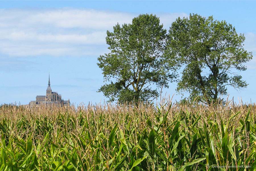 Mont-Saint-Michel, framed by crops in a farm field, and a blue sky overhead.