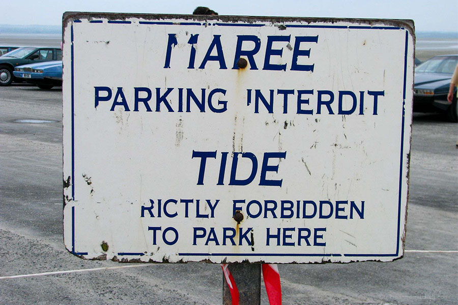 A sign at Mont Saint Michel's parking lot says "Marée Parking Interdit - Tide Strictly Forbidden to Park Here"