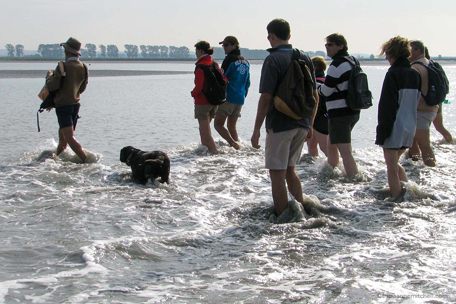 A tourist group and a dog wade through. the water as the tide comes in at Mont Saint Michel, France.