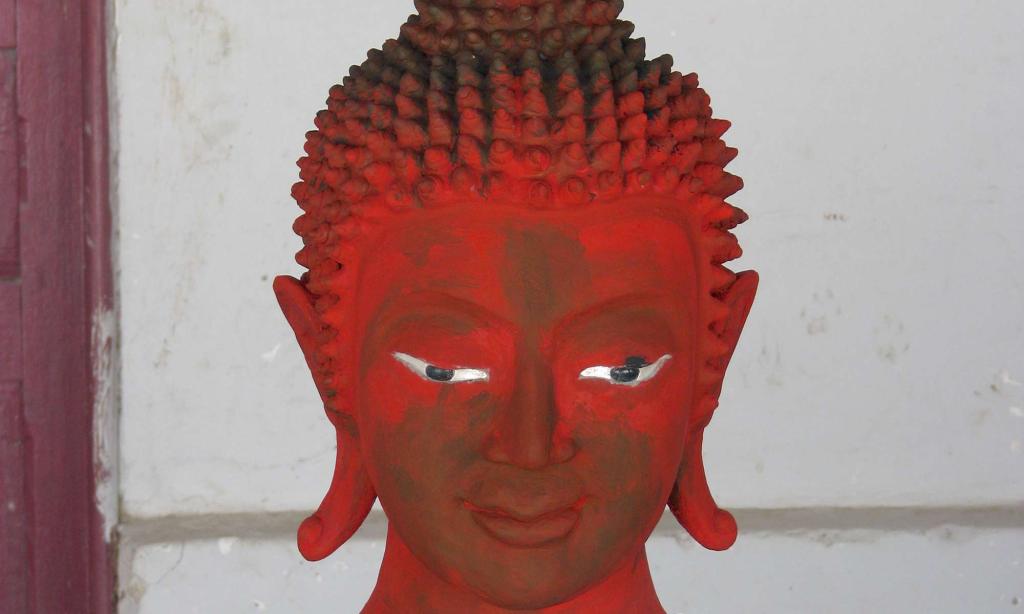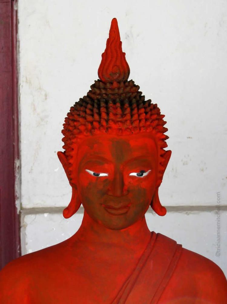A vibrant-red Buddha is the focus point of a courtyard in Luang Prabang, Laos.
