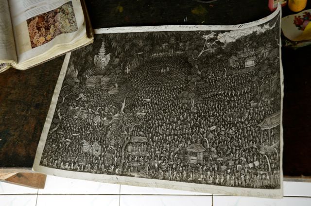 Wayan, probably in his twenties or thirties, explained that he descends from a long line of artists. As we walked through the serene courtyard, Wayan told us of his passion to keep his village’s style of art alive. In order to do so, Wayan teaches young men how to meticulously put paint brush and colored ink to paper so that they can create art depicting Balinese Hindu gods, as well as agricultural and cultural vignettes. Small pieces may require three or four days to complete, whereas larger works will take months.