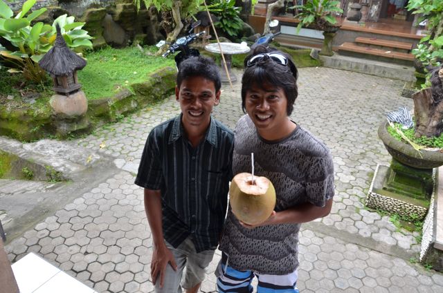 When we arrived at Wayan’s family home, he led us into the tranquil courtyard and greeted us with a refreshing beverage – straight out of a young coconut via a straw. A bird gently chirped from a nearby cage. One of Wayan’s older family members wove vessels out of palm leaves, while sitting in the shade of the family temple; a young child toddled about.