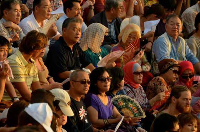 Hundreds of visitors crammed into the circular seating area. Shawn and I, along with the attendees, wore sarongs of various colors. Most were the grape-colored versions loaned out by the temple.