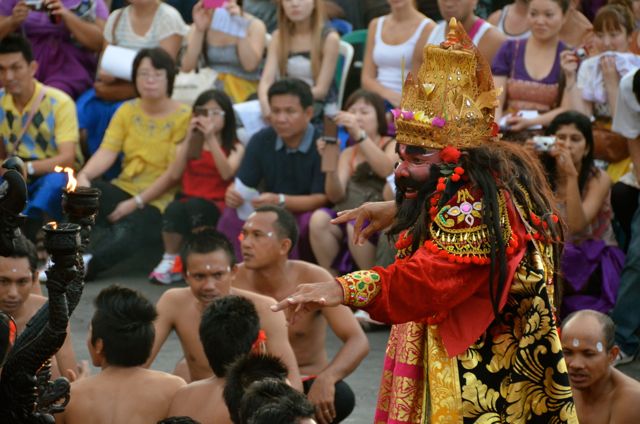 Not long after we sat down, approximately 40 bare-chested men, donning black and white sarongs, red sashes and crimson flowers tucked behind their right ears, began the trance-inducing chak, chak, chak chanting that would continue for almost the entire duration of the Hindu Ramayana performance. The men’s choir would be the performance’s sole soundtrack. No instruments were played.