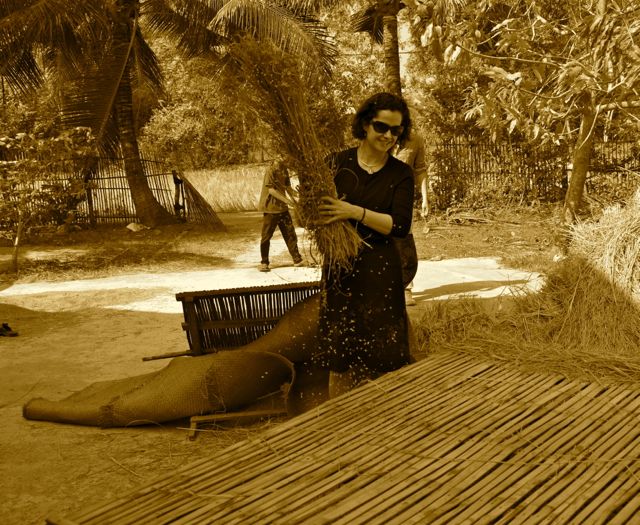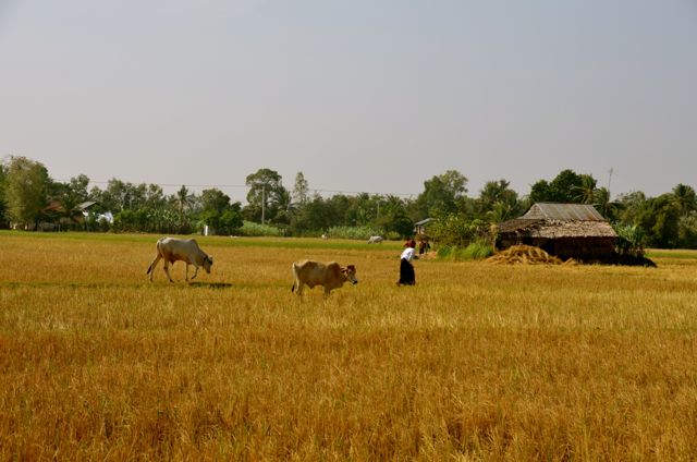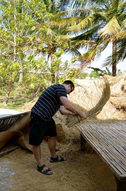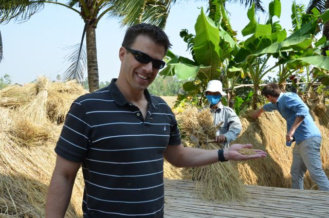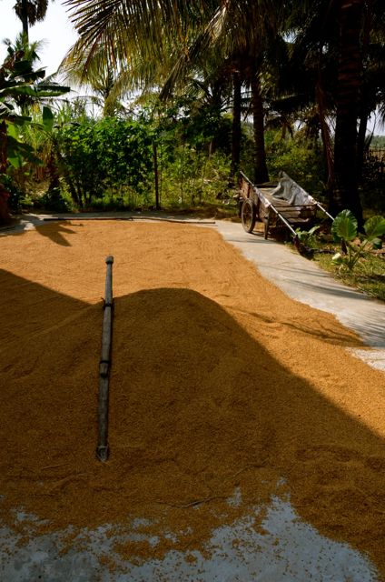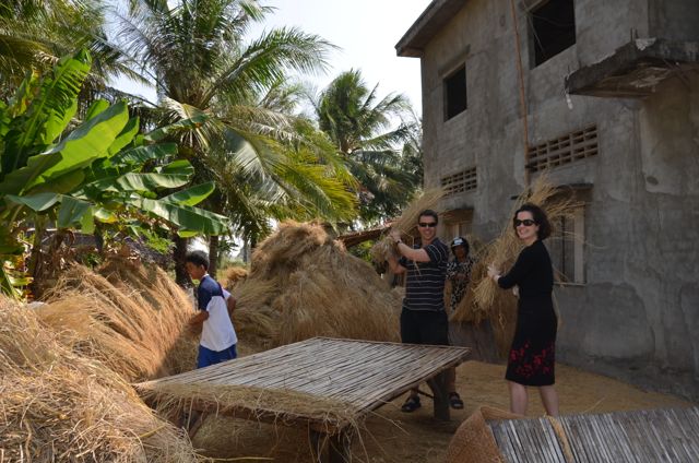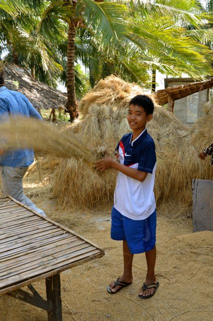 On Christmas Morn, on a family compound in Cambodia’s Takeo Province, we learned how to thresh rice. Following the cues of our bed & breakfast owner’s cousin, we thrashed the dry bundles against a table comprised of thin wooden slats.