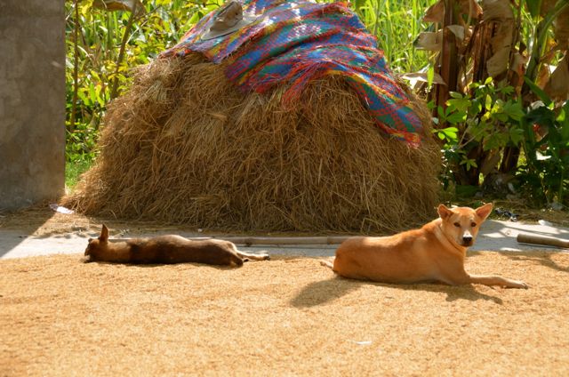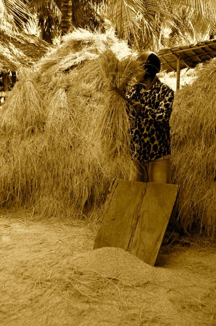 When finished threshing a bundle, we tossed it into a blonde pile of empty stalks. The stalks would eventually become cow feed and the mountain of rice would then be transferred to a machine through which it would be processed to remove its husk.