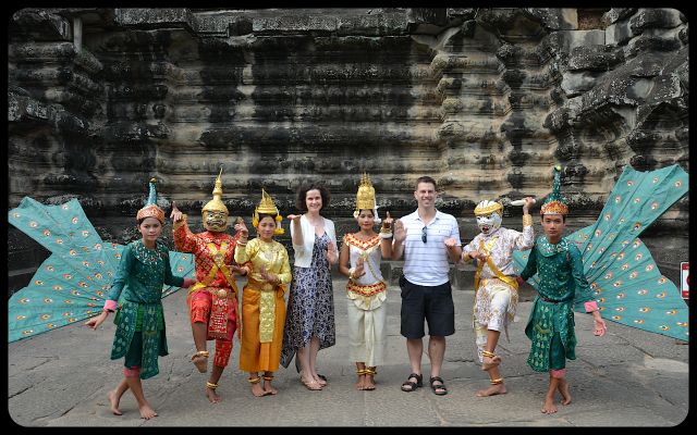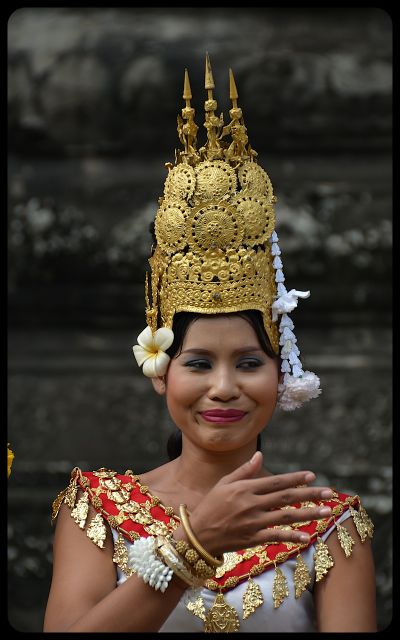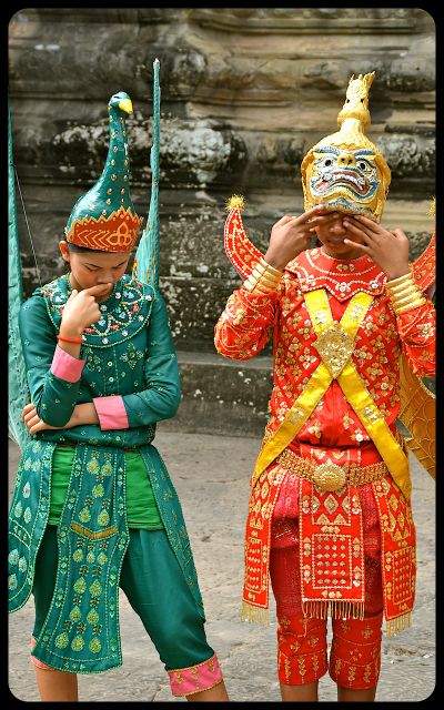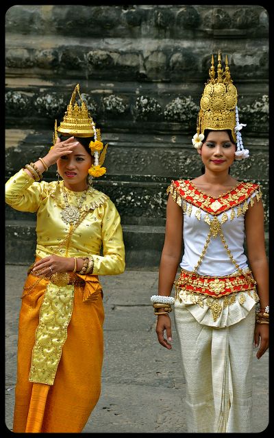 The silken costumes with gold embellishments transform these Angkor Wat models into winged creatures, apsaras, and other mythological beings from Angkorian times. They position themselves in a prime location within Cambodia’s famed Angkor Wat complex.