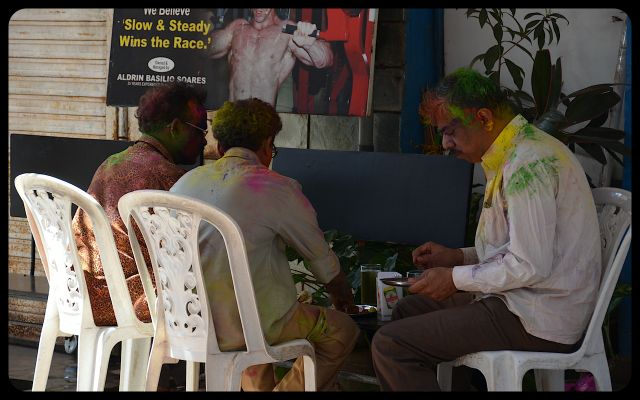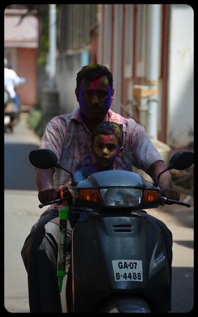 As we prepared to take on streams of colorful powder and water this morning, we watched the playful mayhem on the street below our Panjim, Goa guesthouse. Like toy soldiers, children held fluorescent plastic squirt guns and water balloons, waiting for the moment when they could ambush vehicles and motorists with jewel-toned water and powder.