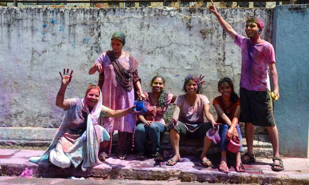 When we finally took to the street, armed with a plastic bag to shelter our cameras, we encountered a jubilant pack of merrymakers. Noticing our squeaky-clean clothing, the group parted, allowing us to pass untouched. We asked them to slather on some colored goodness. They obliged — swirling orange, red and yellow powders onto our faces. Despite the fact that they were gentle on us, we officially felt like part of the club.
