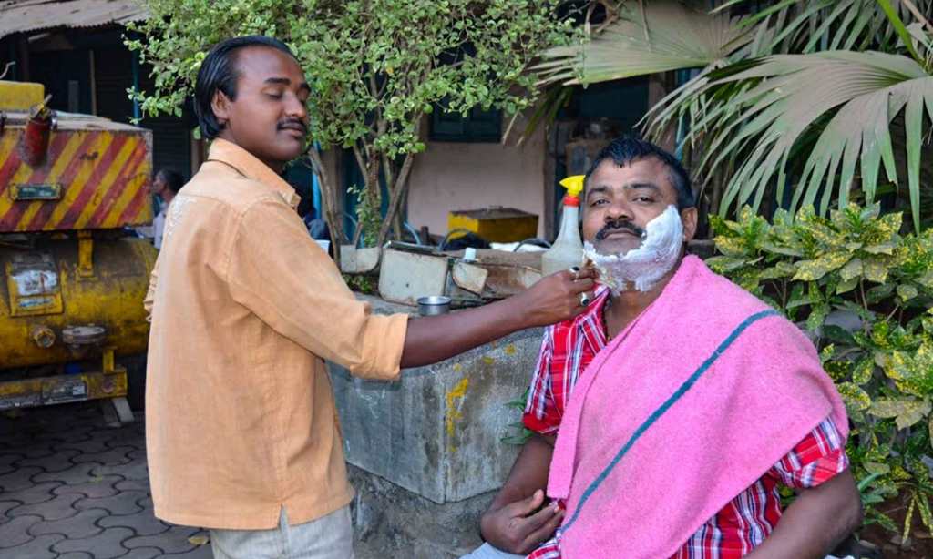 Anticipating a 14-hour drive behind the wheel of a sleeper bus bound for Goa, our driver took a brief repose with a streetside shave from a roving barber.