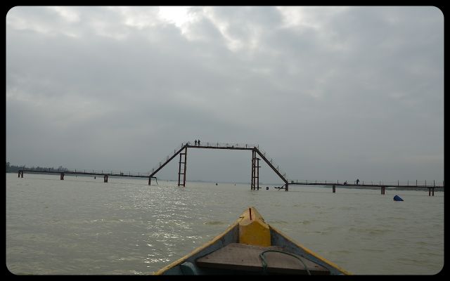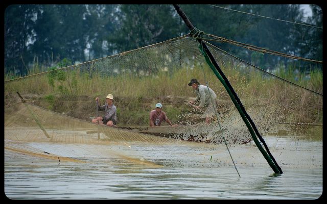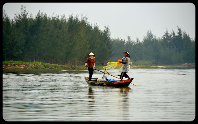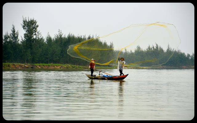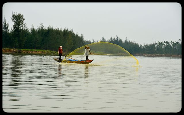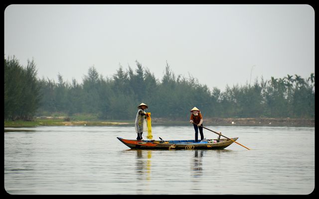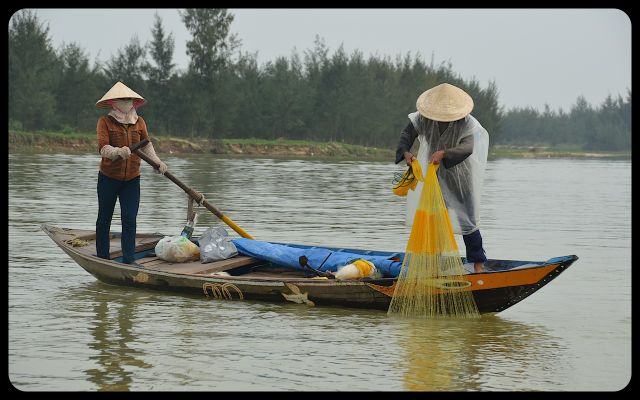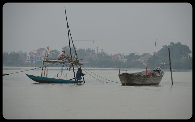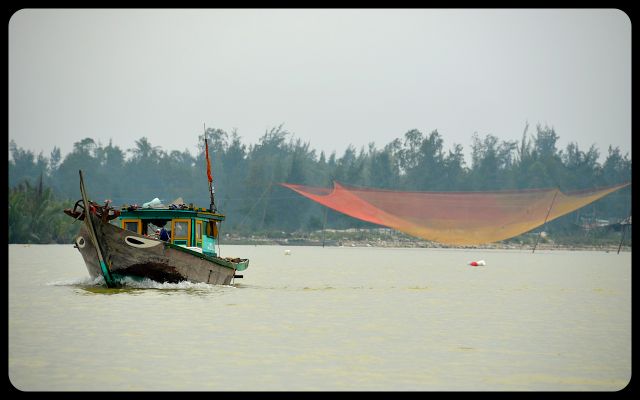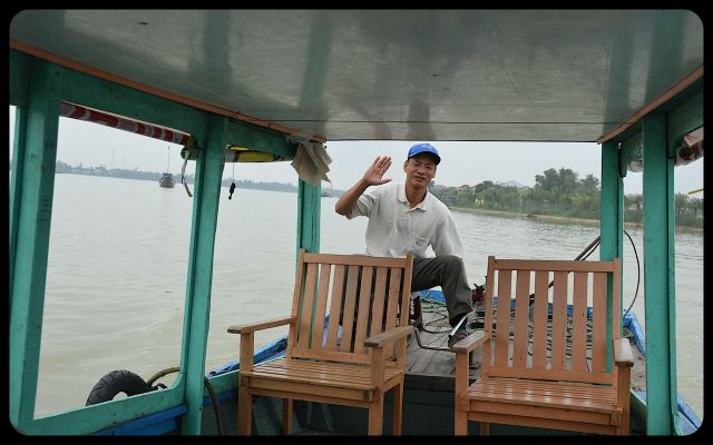 During the return to Hoi An’s city center, we floated past a couple dramatically casting a net into the water. We also encountered Chinese fishing nets that were waiting to be dipped into the water for an early evening catch. They stood with impressive posture. Then we saw the early stages of a bridge; the engineers waved to us in a proud manner as we passed underneath.