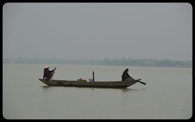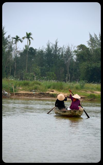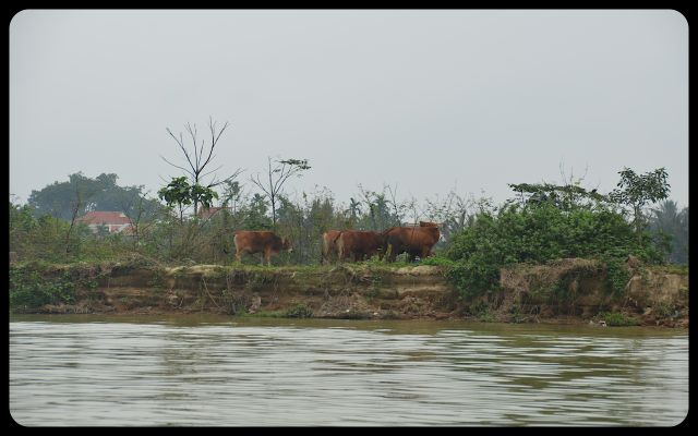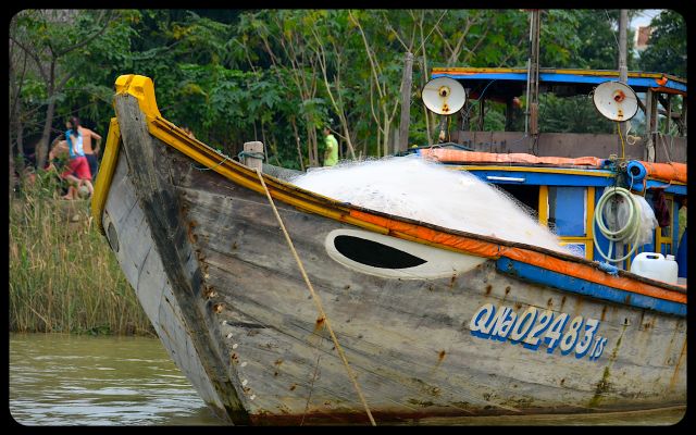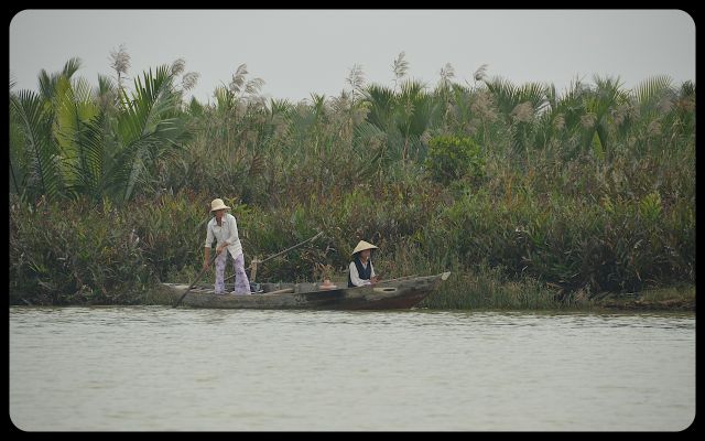 Unlike Hoi An’s bustling marketplaces and tourist districts, the waterways were tranquil. The overcast sky lended comforting hues to the Mekong’s waters. It was fascinating to watch the action on land from the water. Two teenage boys rode a bicycle in front of a saffron home’s front. An elderly woman dipped a bucket at the water’s edge. Water buffalos waded through the water. Two ladies, piloting a boat and wearing nón lá hats (or ‘leaf hat’), gracefully glided by.