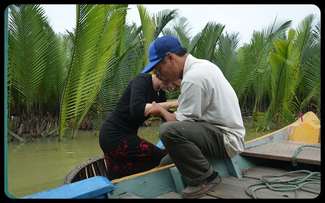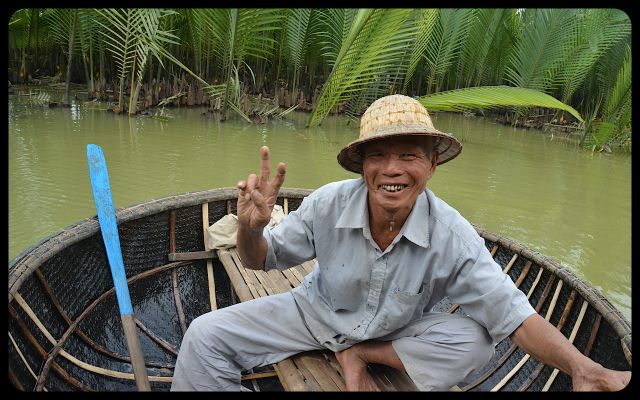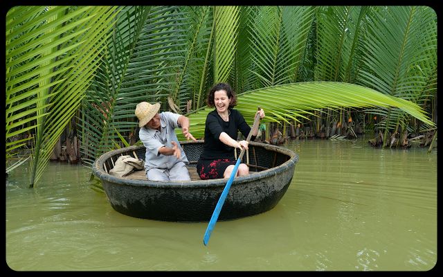 But it was too late. The energetic boat’s navigator had rowed his boat to meet ours. With a wave of his hand ushering me in, I knew that I had the unique opportunity to ride in a Vietnamese basket boat. And I indulged with great gusto.