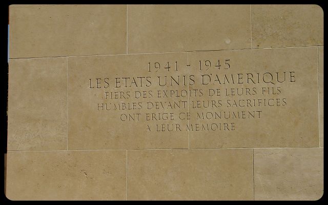 “1941-1945: Les Etats-Unis d’Amérique, fiers des exploits de leurs fils, humblés devant leurs sacrifices, ont erigé ce monument, à leur mémoire.”