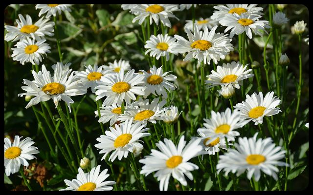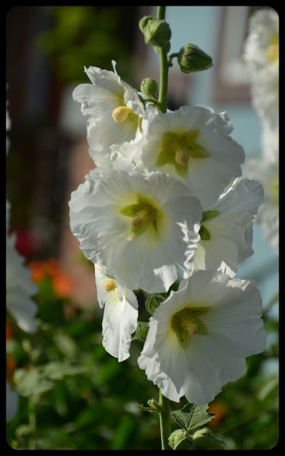 There were beds of happy daisies and hollyhocks,
