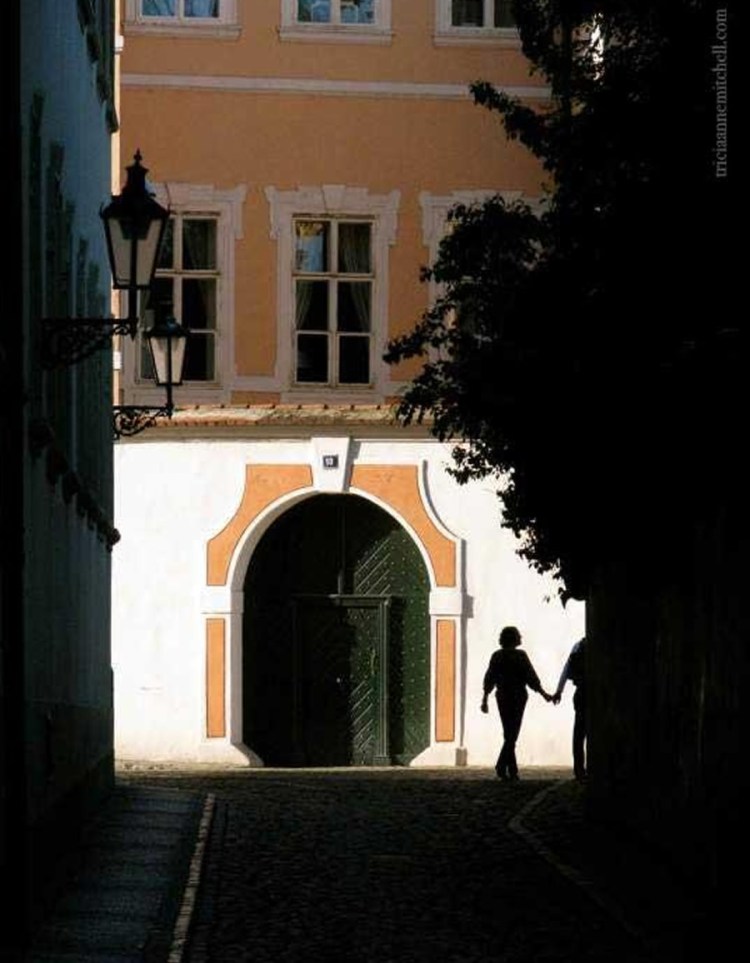 This image was captured on a late spring trip in 2009. Though I wish I had been quicker on the snap, so that I could’ve captured the man’s full silhouette, I loved how the sun illuminated building #10 on this quiet, cobbled lane.
