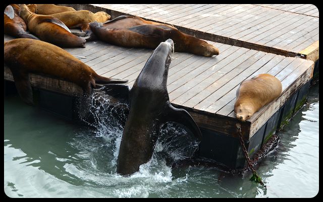 Shortly thereafter, a sea lion bully bumped a neighbor lion off his plot of land, plunging the slumbering fellow into the chilly water. The crowd giggled, capturing the disappearing fin, and the kerplunk caused by the dunked sea lion.