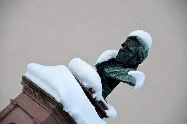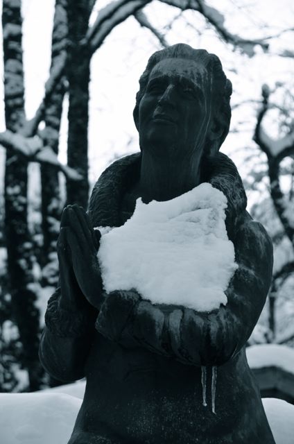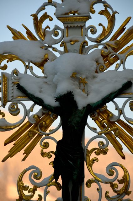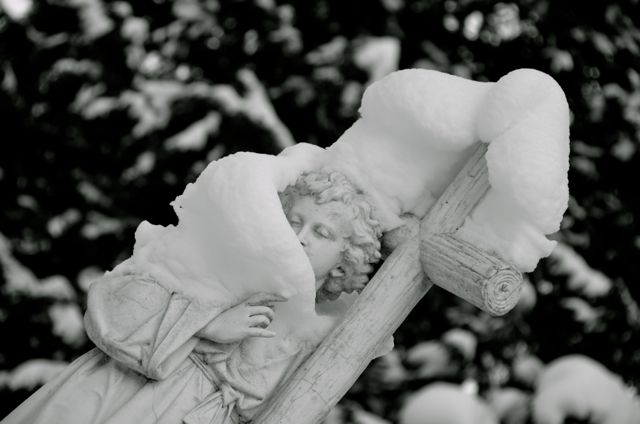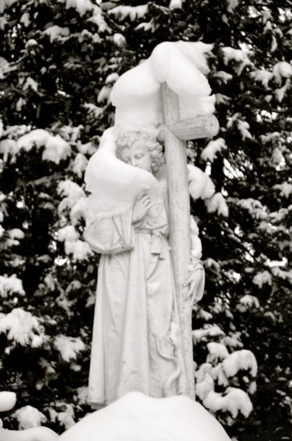 On a recent snowy afternoon, we stepped through the cemetery’s ornate iron gate to glimpse the cemetery with a fresh dusting of snow. A stole-like whisp of snow appeared to cascade around one saintly figure’s neck. Some statues looked as though they had epaulets of snow on their shoulders. One bust seemed as though he had on a Napoleonic hat. Mother Nature’s recently-fallen, glistening winter accessory clung to iron crosses, gates, and the elegant skeleton-like branches of neighboring trees.