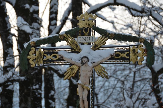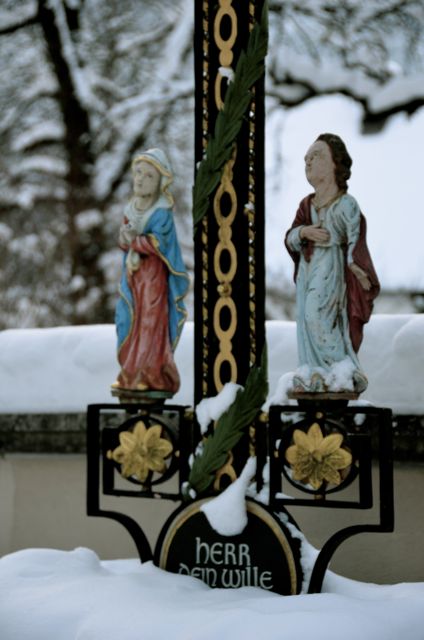 Just a few blocks from my parents’ home in Oberammergau, Germany is the St. Peter & Paul Church and Cemetery. The Rococo-style church that anchors the small cemetery was built from 1735-1749. Since the cemetery is just seconds’ away from the village’s center, we often pass it on the way home following an afternoon of errands. When we attended a picturesque Christmas Eve midnight mass service at the church, we saw young women, dressed in traditional Bavarian attire, placing candles at their loved ones’ graves. We learned that it is a tradition to do so here on Christmas Eve.