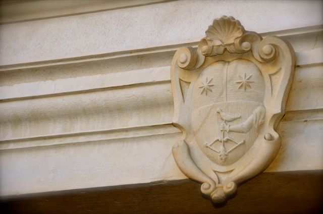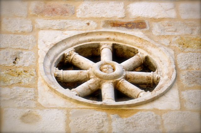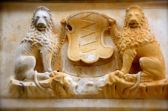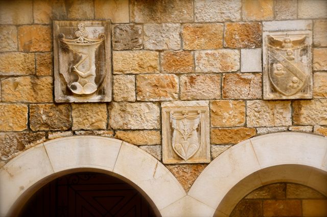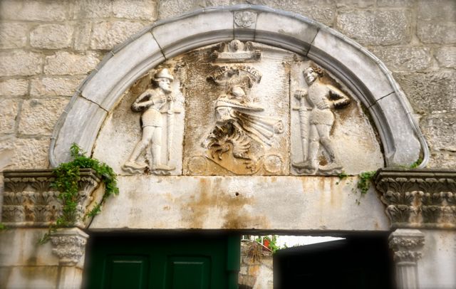 My husband and I have solved some of the mysteries about these limestone motifs, thanks to chats with locals, and scant research. On the Ćipiko Palaces’ south gate (image above) is the Latin saying nosce te ipsum (know thyself). A father and son built these neighboring palaces, which are heavily adorned with multiple family coats of arms.