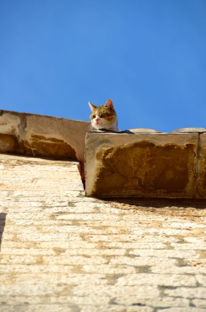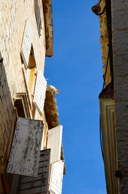 Unlike me, this photogenic feline (or mačka in Croatian) is indeed no scaredy cat! For a few minutes, I watched from down below, trying to coax her away from the roof of a stone building she was sunning on. Fortunately, she didn’t jump to the shutter, which was precariously blowing in the breeze.