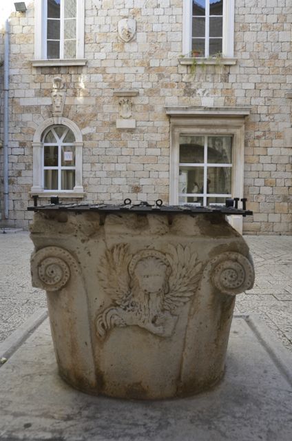Nearing Trogir’s main square, Trg Ivana Pavla II, named after Pope John Paul II, we stopped at the Cipiko Palace, which was once home to the Cipiko family’s well-known writers, artists and historians. The large rooster replica in the entryway, Natalija explained, was seized from a Turkish ship by a Cipiko family member during a pivotal 15h-century battle. High up on the building’s front façade are beautiful windows that would be equally at home overlooking Venice’s canals.