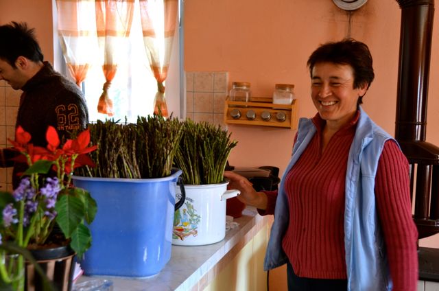 Finally, I hit the asparagus jackpot – a tangled area in a corner, hugging a stone wall! I was happy to contribute to the meal that the ladies were working so hard to create.