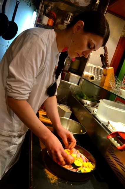 First, Anita washed and sliced a brilliant mélange of vegetables: potatoes, carrots, onions, and zucchini, arranging them in a flat, round tray.