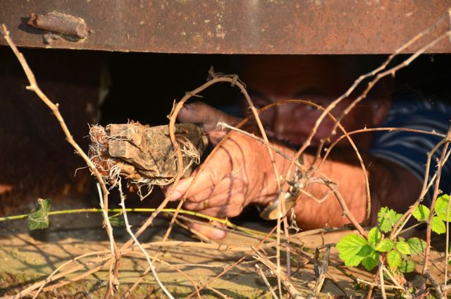 Zef mimicking a destructive chop to the bunker. He thinks they should be destroyed and used for scrap metal.