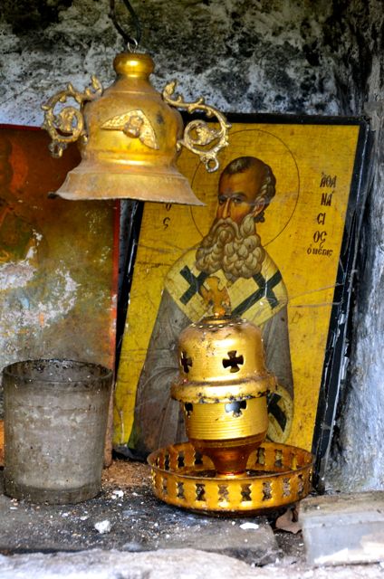 As we wound underneath an oak tree’s branches, we spotted a monastery that most visitors to Meteora never see – the Ypapanti Monastery. It doesn’t sit atop rock formations. Instead, it appears to be clinging to the side of one. George explained that the Ypapanti Monastery is one of several monasteries that is no longer active. It’s currently closed to the public.