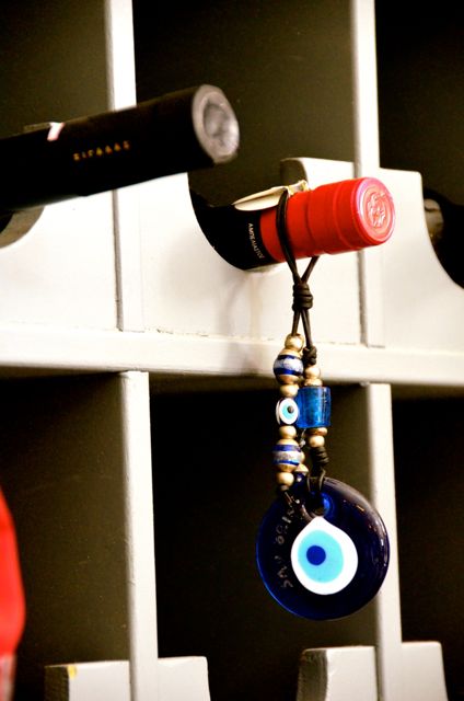 Transitioning into our course’s wine section, Georgia drew our attention to the restaurant’s wreath-adorned lights overhead, explaining that they were actually old grapevine roots. Instead of cultivating vines vertically on stakes, Santorini winegrowers train the grapevines to grow into a large basket shape low to the ground. In doing so, the grapes are protected with their own leaves. This shields them from intense heat and wind and allows morning dew to collect, which in turn provides essential moisture. The volcanic pumice in the soil also lends a hand, helping to protect against diseases like Phylloxera.
