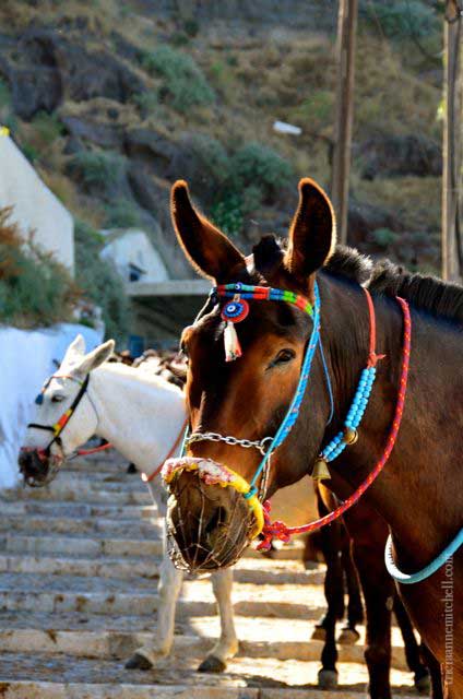 A donkey, decked out in colorful beads and an evil-eye amulet, awaits the day’s passengers on the stairs leading up to the village of Fira, on the island of Santorini.