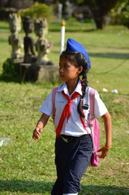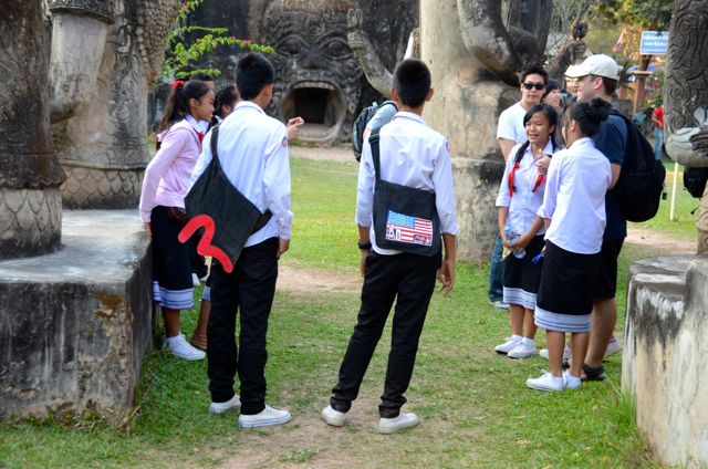 “Can we take your photo?,” the young Laotian teenager asked Shawn. And then a group of boys and girls approached me. One had an American flag emblazoned on his bag. The girls wore uniform Laotian sinh or skirts.