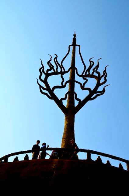 - Buddha Park’s sculptures are made of reinforced concrete, but be sure to exercise common sense — especially when climbing the “giant pumpkin” — as there is some unexposed rebar, and the railing at the top appeared precarious.