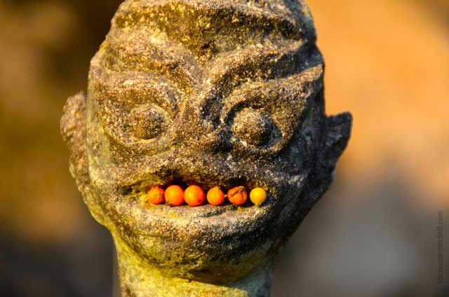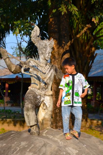 In an attempt to show the park’s more-solemn side, I tried to compose a scene replete with spiritual offerings: marigold flower garlands and half-full Pepsi bottles sitting at a statue’s base. Suddenly, a young girl hopped in front of my lens, her braids swinging back and forth, a wide grin on her face. Her father was at first embarrassed that she’d strutted in front of my camera, and he tried to lead her away. However, within minutes, the outgoing girl and her older brother let me take a few pictures. They flashed peace signs, rode in the mouth of a crocodile or naga figure, and tried to mimic the park’s sculptures.