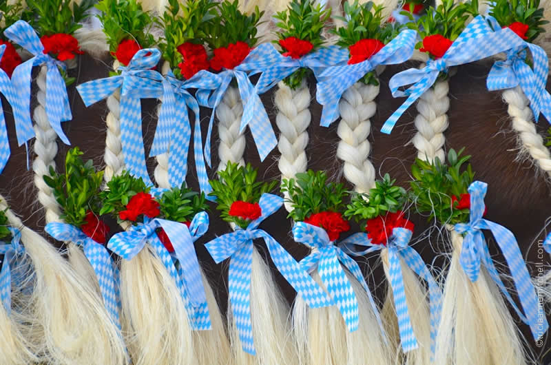 Police officers on horseback, as well as a Munich bishop had all come to Unterammergau to facilitate the open-air blessing, which lasted for approximately one hour. Having gotten up around 4 am for mane and tail-grooming sessions, I noticed some yawning owners and restless horses fidgeting during the ceremony. The Catholic service culminated with the bishop and priests blessing the horses with spritzes of water, while altar boys carried silver thuribles that had incense wafting from within. The participants and their horses then returned to their respective villages, while spectators congregated in Unterammergau’s town square for a traditional concert.