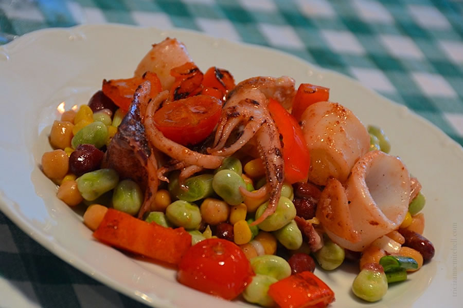 - Grilled Squid & Vegetable Salad: A vibrant-colored blend of cherry tomatoes, red peppers, corn, broad beans, chickpeas, and grilled squid drizzled with lemon juice and olive oil.