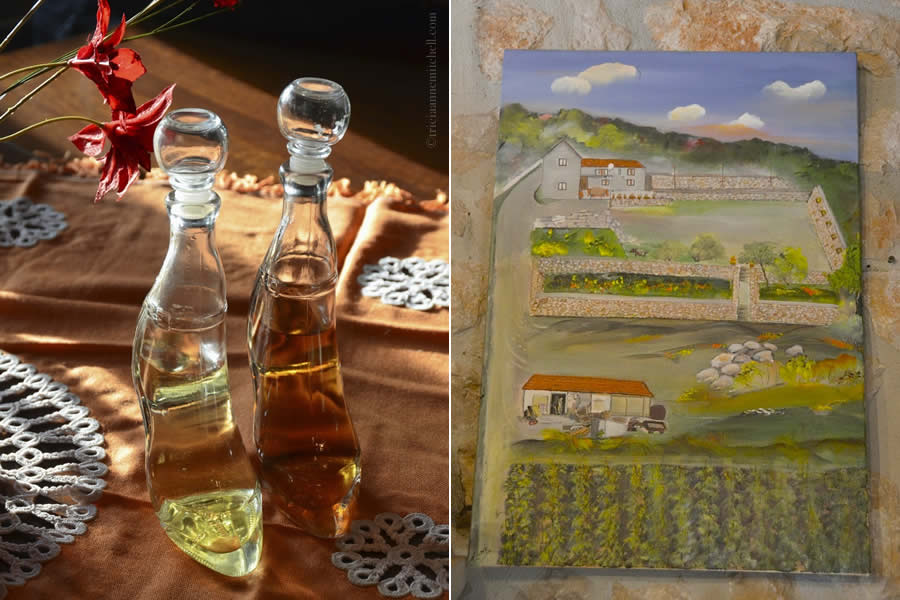 Whimsical bottles shaped like ladies’ shoes hold the Krolo’s homemade Rakija, which is Croatia’s version of Grappa or brandy. We were treated to walnut (orah) and cherry versions (víšnja). On the right, an artist’s interpretation of the Krolo’s country home and grounds.