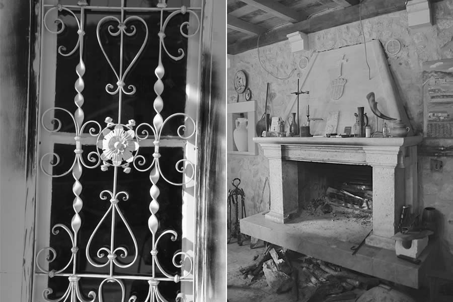 An intricate iron door salvaged from a demolished building greets visitors to the Krolo Winery. On the right, stone walls and a handsome fireplace adorn the home’s entryway.