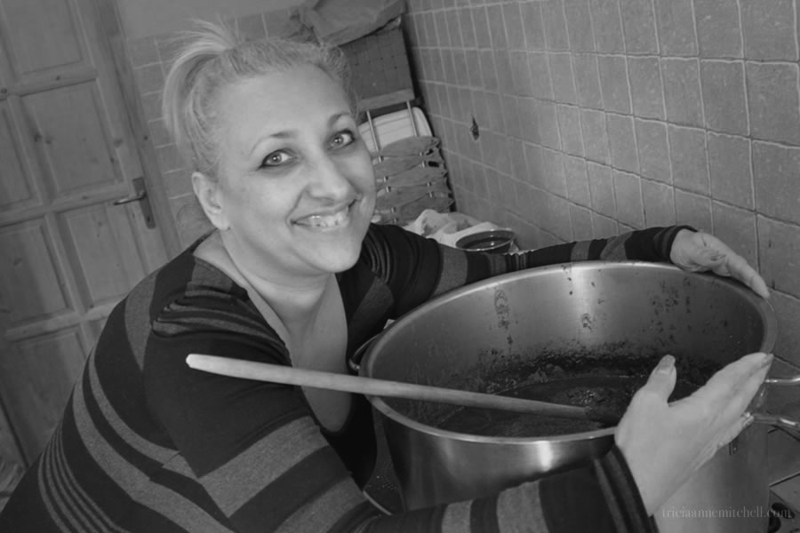 Ever playful, Karolina carefully guards the pot of Pašticada, which was made with 4 kg. of vegetables and 2 kg. of prunes. Though some Croatian cooks marinade their Pašticada for a longer period of time, Karolina prefers to marinate hers for only four hours to avoid an acidic taste.