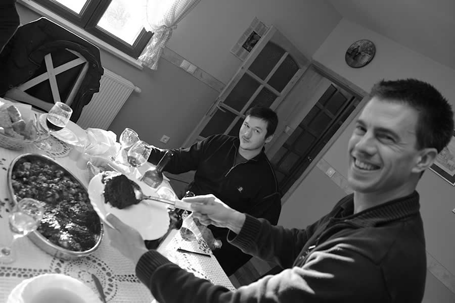 A dish as prized as Pašticada creates competition among the diners. :) Here, Srđan’s friend Tino looks as though he is mischievously guarding the stewed beef dish as Shawn serves up a generous scoop.