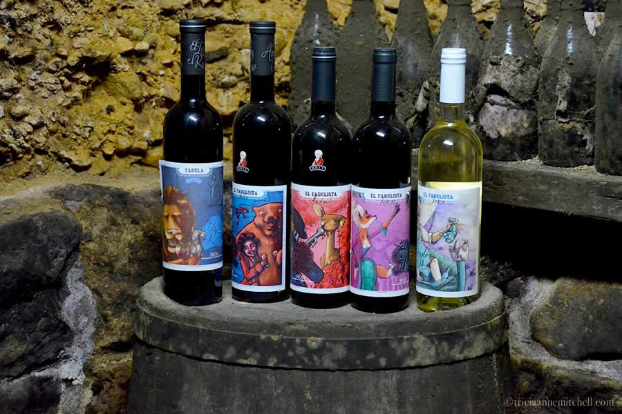 Trading Rioja Alavesa’s open fields for cobblestone lanes, we landed at our last wine tasting stop at El Fabulista, in the walled town of Laguardia. Met by the winery’s outgoing employee Mar, we learned that the building was formerly a palace, and once home to famous fable author, Félix María de Samaniego. Today, the labels at the traditional winery bear the likeness of his fables’ characters, and even contain snippets of his tales.