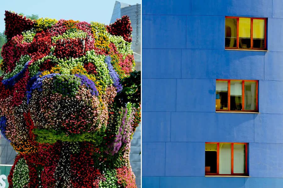 The 12 meter-tall canine (about 40 feet), modeled after a West Highland White Terrier pup, is comprised of thousands of flowers. It stands guard in front of the shimmering Guggenheim Museum, which was designed by architect Frank Gehry, and opened in 1997.