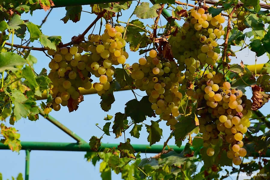 The wire arbors over the homes’ driveways were brimming with grapes wearing muted amethyst, plum, and seafoam-green hues. They ranged from smaller clusters to plump specimens, calling me to spirit away a bunch or two. They looked so tempting.