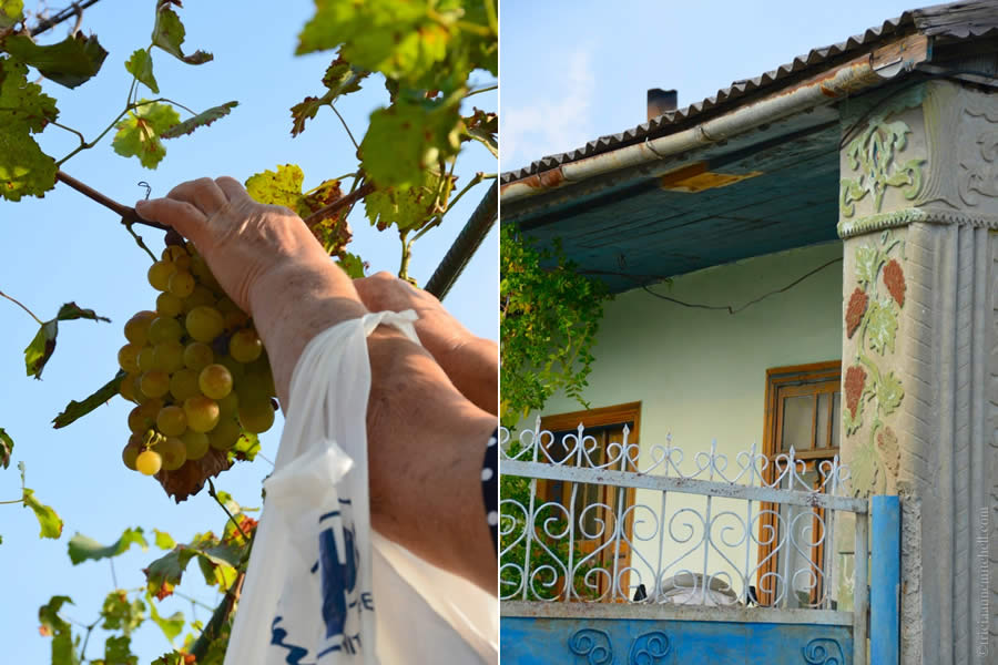 As I stopped to photograph a green trellis studded with grapes overhead, two women chatting on the street, called out to us in Moldovan.