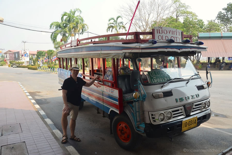- If you’re staying in a guesthouse near Sukhothai’s bus station, there is a shuttle (songthaew) at the bus station that’ll take you to the historical park. When we were there this shuttle was a vintage Isuzu with an ‘Old City’ sign on top. A one-way ticket cost 30 baht. We rode this songthaew back and forth.